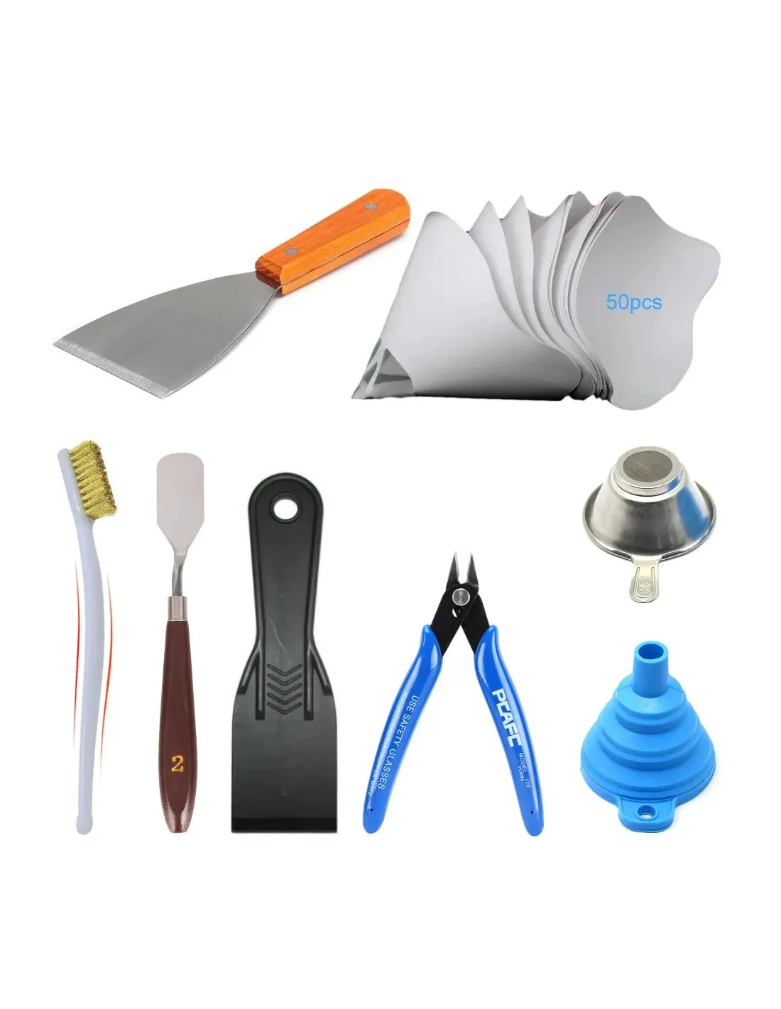 Dieses Set deckt die häufigsten Anforderungen des täglichen Arbeitens mit Resin-3D-Druckern (MSLA, DLP, SLA) ab: vom Befüllen und Filtern des Tanks bis zur Entnahme von Teilen und der Wartung der Maschine.
