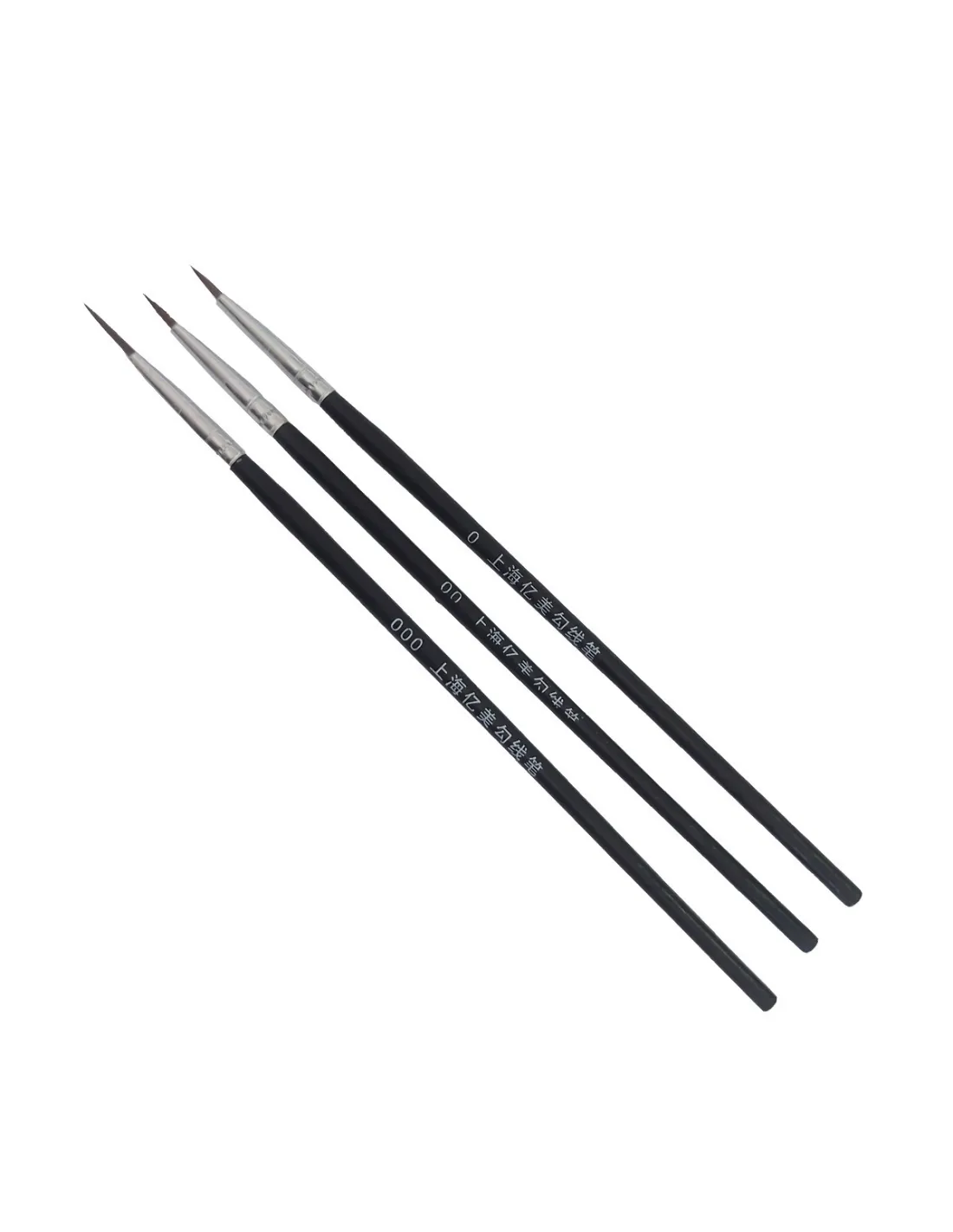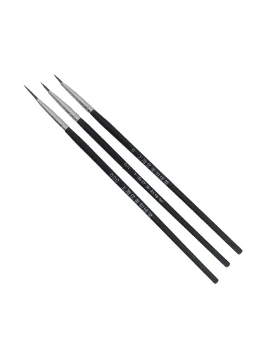 Die Zahl gibt die Dicke der Borsten an: Je mehr Nullen, desto feiner der Pinsel. Größe 0 ist der größte im Set, geeignet für mittlere Detailbereiche; 00 ist mittel; und 000 ist der dünnste, ideal für sehr feine Linien, Konturen und Lichtpunkte bei Miniaturen oder Spezialeffekten.