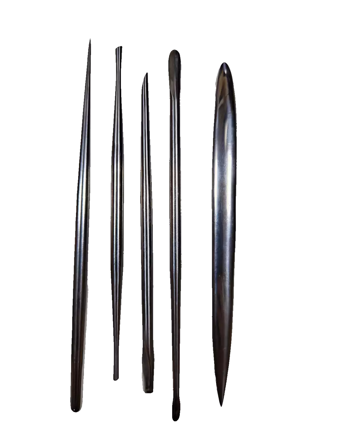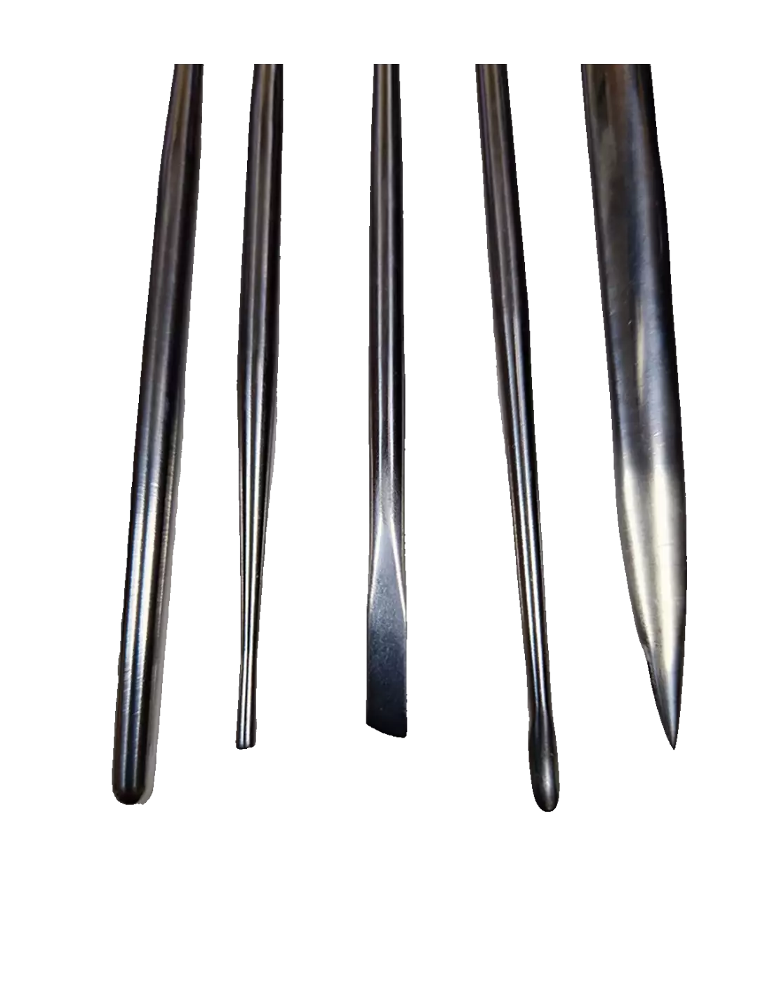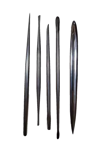 Das Kit enthält 5 Werkzeuge, jedes mit einer anderen Spitzenform, die die grundlegenden Anforderungen eines vollständigen Arbeitsablaufs abdecken: grobes Abtragen, Volumenaufbau, Texturierung und Feindetailarbeit.