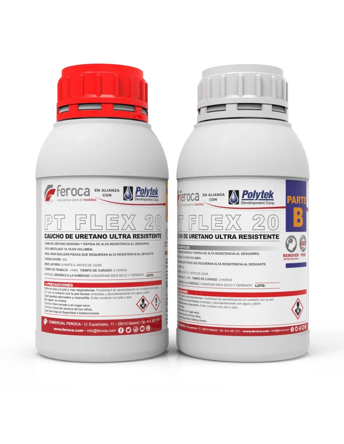 Alle drei sind Polyurethan-Kautschuke derselben Familie mit 1:1-Verhältnis nach Gewicht und Entformung nach 2 Stunden, unterscheiden sich jedoch in der Härte: PT Flex 20 ist der weichste (Shore A20, Dehnung 770 %), PT Flex 60 bietet eine mittlere Balance (Shore A60) und PT Flex 85 ist der steifste der Serie (Shore A85), empfohlen für Strukturteile wie Silent-Blocks oder Motorlager.