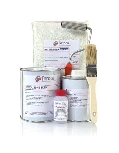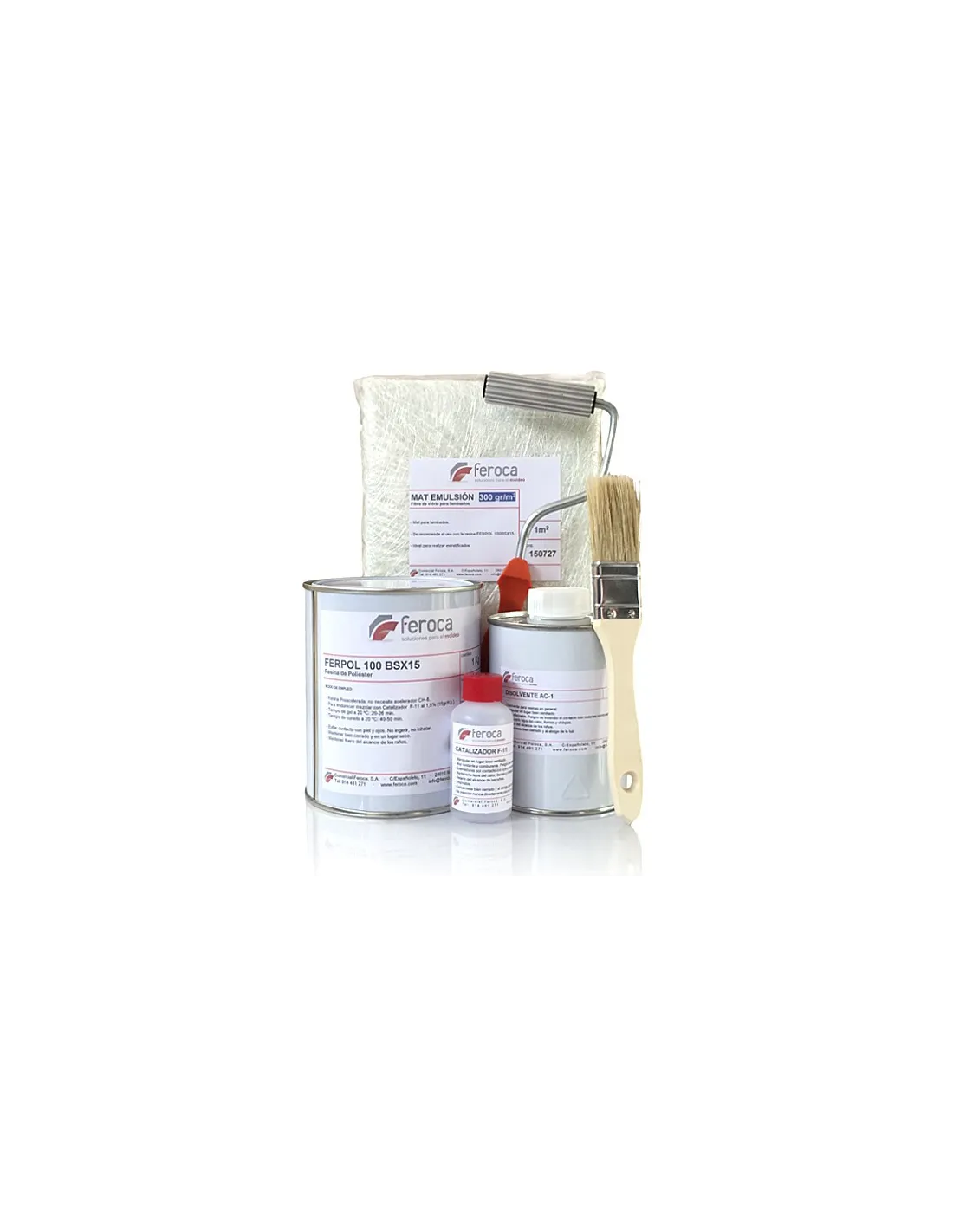 Das Polyesterharz-Reparaturkit von Feroca vereint in einem einzigen Pack alles, was du für Reparaturen und kleine laminierte Bauteile aus Glasfaser benötigst – ohne einzelne Komponenten separat suchen zu müssen. Enthalten sind die Polyesterharz Ferpol 100 BSX15, Glasfasermatte, Laminierungswerkzeuge und Aceton AC-1 zur Reinigung: ein Kit, das sofort einsatzbereit ist, ohne berechnen zu müssen, welche Materialien benötigt werden.