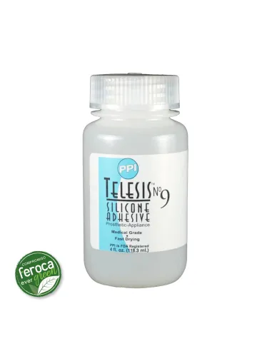 Telesis 9 ist der schnellste und fortschrittlichste Silikonkleber in medizinischer Qualität der Telesis-Linie, entwickelt von PPI (Premiere Products Inc.), einem bei der FDA registrierten Hersteller. Er wurde speziell für die direkte Haftung von Silikon- und Latexprothesen auf der Haut entwickelt und überzeugt durch außergewöhnliche Haftkraft, Langlebigkeit und ultraschnelle Trocknung – auch in hochmobilen Bereichen wie Augen- und Mundkonturen.