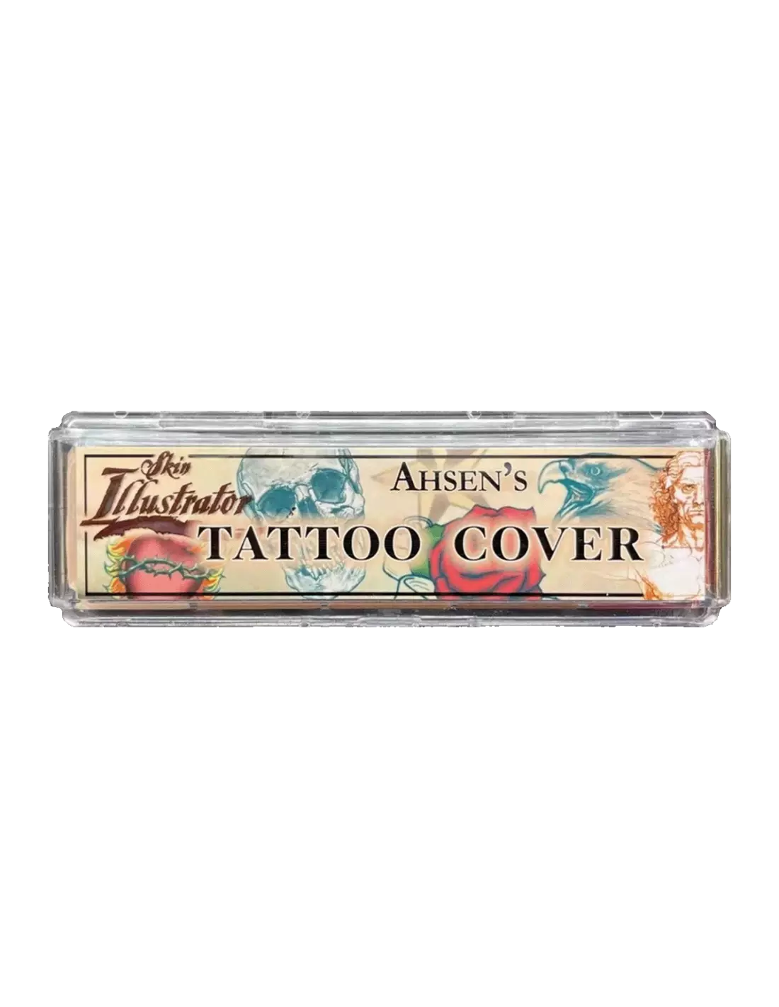 Die Skin Illustrator Mini Ahsen's Tattoo Cover ist eine alkoholbasierte Make-up-Palette speziell zur Tätowierungsabdeckung mit 5 sorgfältig ausgewählten Hauttönen: Rice Paper, Natural 1, Bamboo 2, Espresso 1 und Rose Adjuster. Formuliert für professionelle Make-up-Künstler, Spezialeffekte und Charaktermaske, bietet sie eine deckkräftige und langanhaltende Abdeckung auf natürlicher Haut, Silikon und Latex.