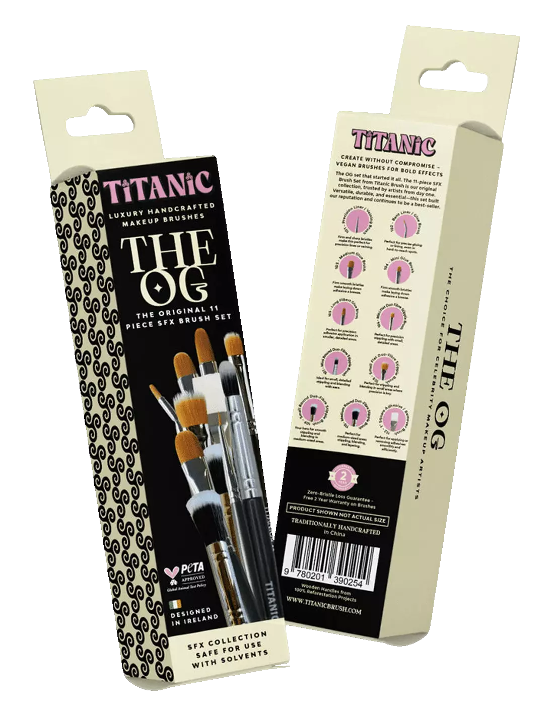 Das 11-Pinsel-Set Titanic FX The Original ist das Referenzwerkzeug für Maskenbildner im Bereich Spezialeffekte, die mit Prothesen, Latex, Silikon und Charakterisierungsmaterialien arbeiten. Speziell für den FX-Bereich entwickelt, vereinen sie vegane synthetische Borsten mit Lösemittelbeständigkeit und einer nachhaltigen, langlebigen Konstruktion. Wenn du Präzision, Vielseitigkeit und ethische Herstellung in einem einzigen Set suchst, ist dies dein Set.