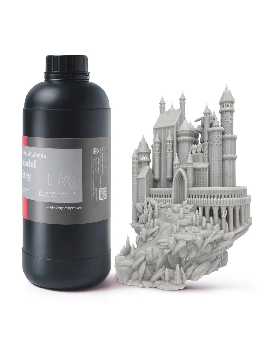 Phrozen Water-Washable Model Gray has a low viscosity (75–175 cps), which favours detail in thin layers. The final level of detail depends primarily on your printer's screen resolution. If you are looking for extreme resolution for high-fidelity miniatures, also consider the Phrozen Aqua-Gray 4K or the Phrozen Aqua-Gray 8K.
