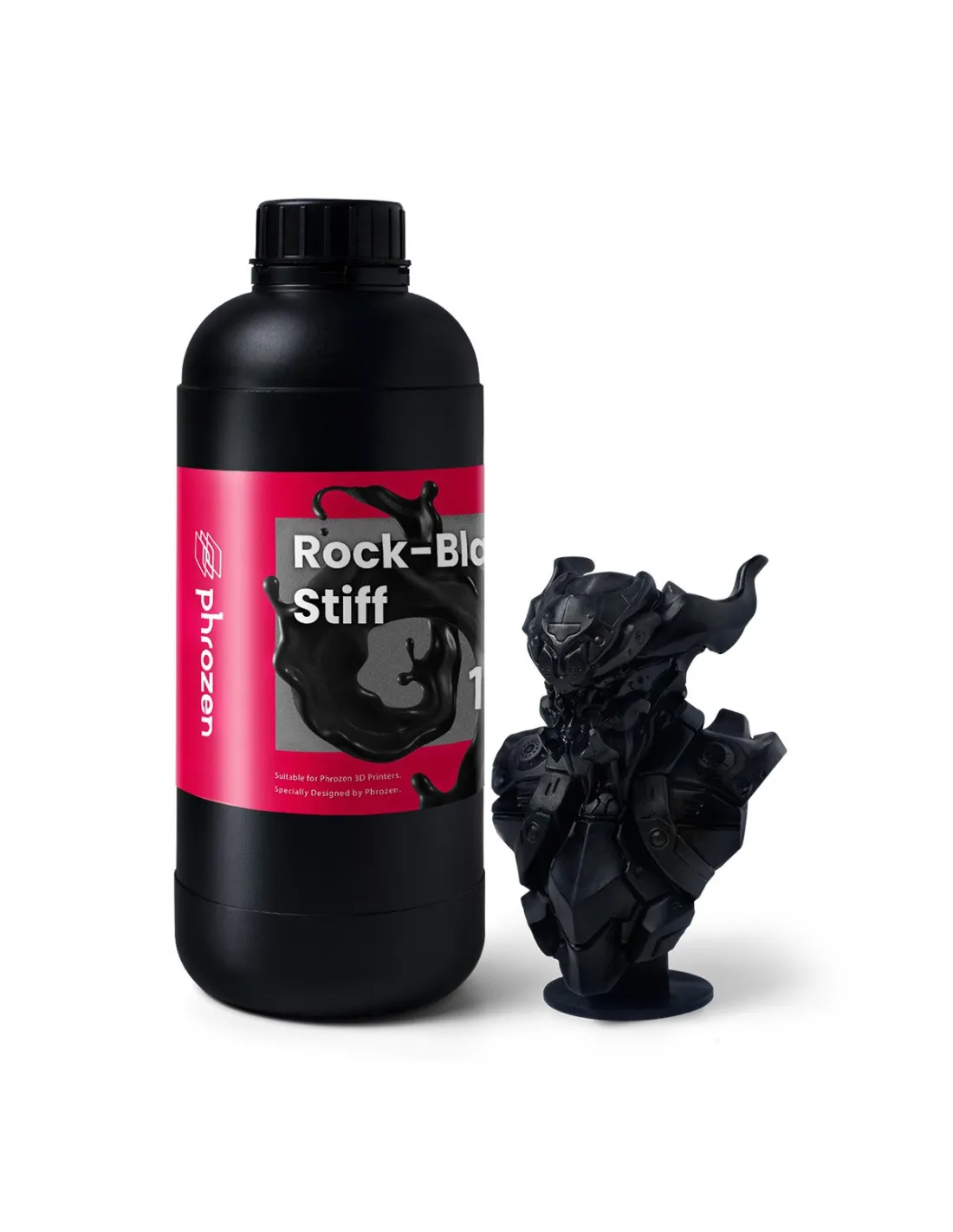 Phrozen Rock-Black Stiff is a photopolymer resin for UV-curing 3D printers (LCD/MSLA) formulated for parts that demand high rigidity, low shrinkage and sustained thermal resistance up to 97 °C. With a hardness of 81 Shore D and an intense black finish, it is the go-to option when a prototype or final part must withstand demanding mechanical and thermal conditions without deforming.