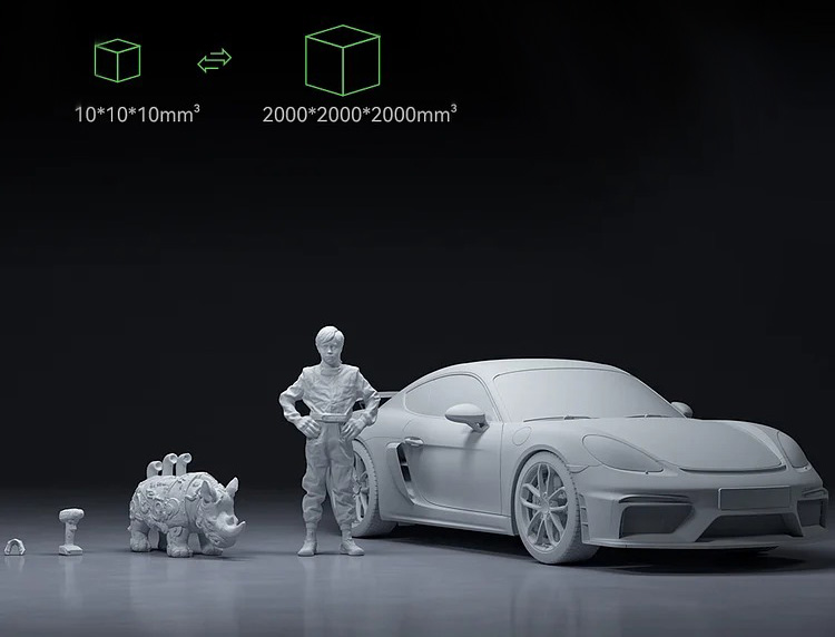 - Scans objects from 10 mm to 2000 mm without loss of detail.