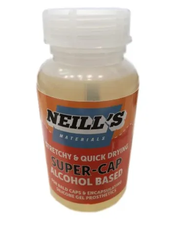 Super-Cap is an isopropyl alcohol (IPA)-based encapsulant designed specifically for silicone gel prosthetics in special effects. Its high elasticity allows natural placement on skin with minimal surface wrinkling, and its absolute transparency makes both mould work and the application of alcohol-activated makeup directly onto the prosthetic straightforward.