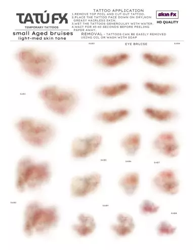 TATÚ FX Fresh Bruises Small is an A5 sheet with 21 small bruise temporary tattoos, designed by a professional makeup artist to deliver believable, camera-ready results without the need for paint or colour corrections. The designs reproduce the different stages of a real bruise, with a colour range optimised for medium and dark skin tones, making it a fast and versatile solution for special effects, character makeup and medical training.