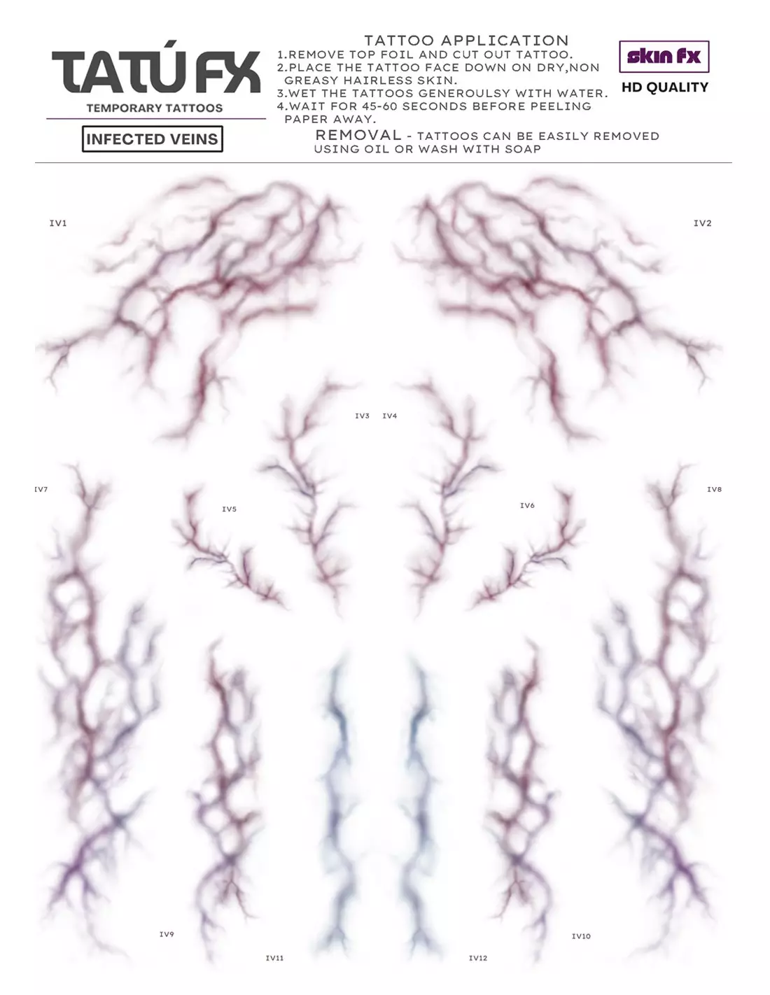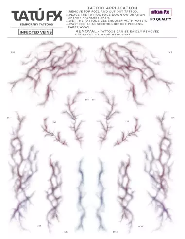 TATÚ FX Infected Veins is an A5 sheet of professional temporary tattoos featuring 12 infected vein designs in different shapes and sizes, designed for special effects makeup that requires a hyper-realistic finish with minimal time and effort. Created by a professional makeup artist and certified as skin-safe, it is the fastest tool to create diseased skin, decomposition or infection effects on any talent, whether on set, on stage or in a photo shoot.