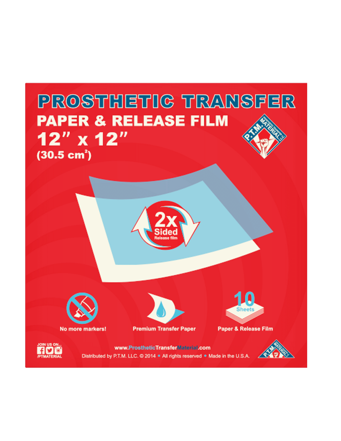 The 12" x 12" transfer paper and 2-sided release film is the perfect size if you are looking to createlarge prosthetics transfers for back, chest or body.