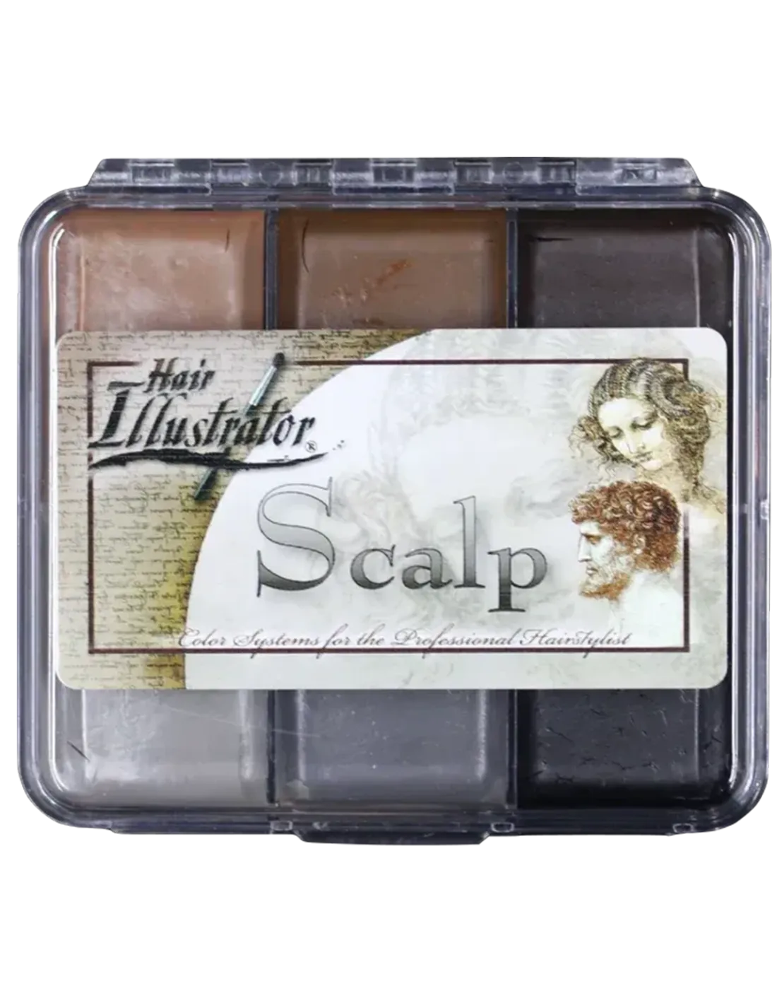 The Hair Illustrator On Set Scalp Palette is a compact alcohol-activated makeup palette, specially formulated for scalp work. Its six colours allow you to cover visible skin areas, darken light or grey roots, and perform quick touch-ups professionally. Compatible with skin, natural hair, silicone and latex, it is an essential tool on any film set or makeup chair.