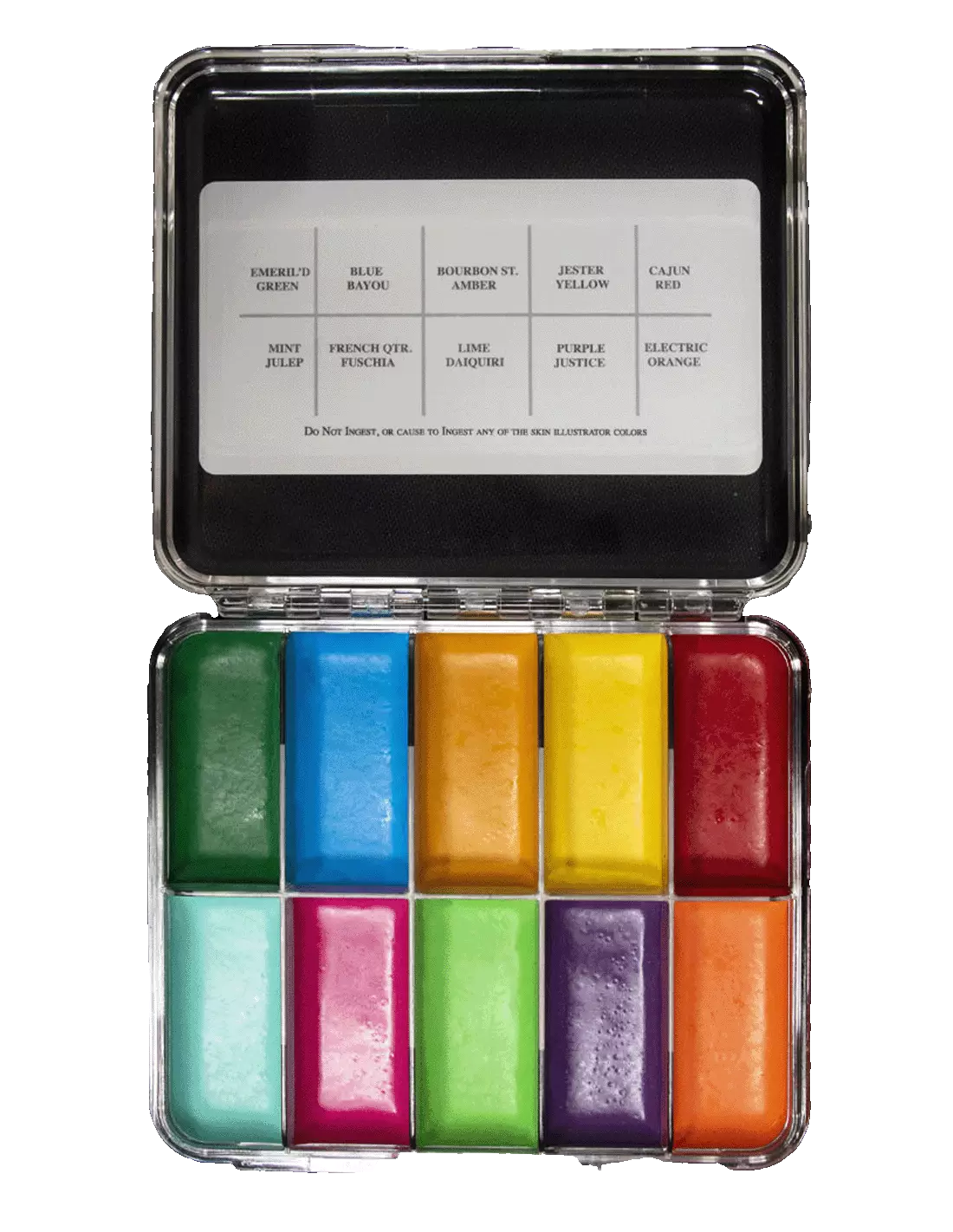 The Skin Illustrator Mardi Gras palette is a collection of 10 high-saturation alcohol-activated pigments, designed for clown and mime characterisations, carnival body makeup, festivals, and looks inspired by the psychedelic aesthetic of the 60s and 70s. Compatible with natural skin, silicone and latex prosthetics, and mixable with any other Skin Illustrator palette to expand your colour range without limits.