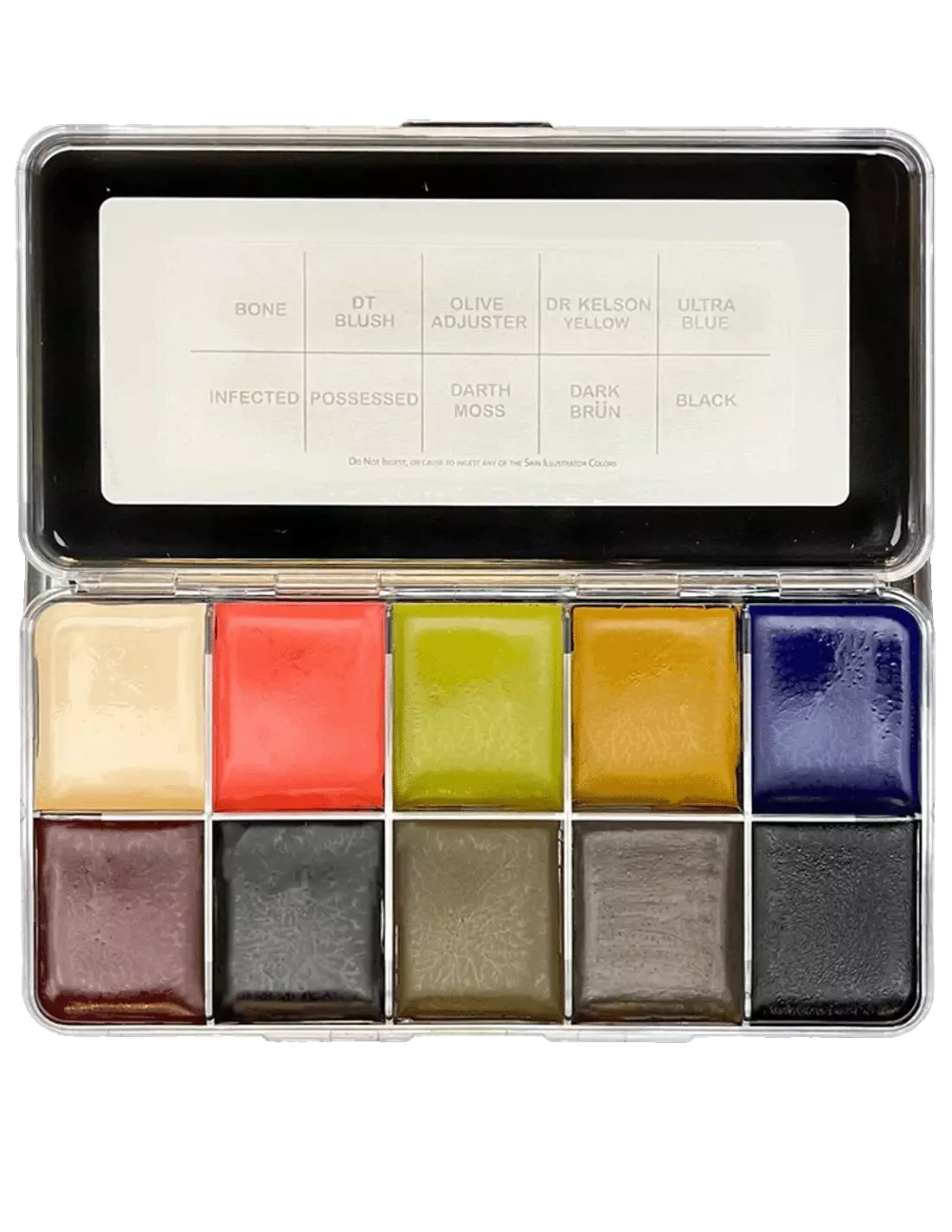 This palette is designed for special effects makeup artists, character makeup artists and SFX artists who need specific colours for wound effects, corpses, infections and extreme skin tones. The 10 shades range from neutral bases to highly saturated, dramatically expressive colours.