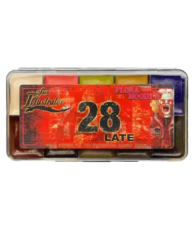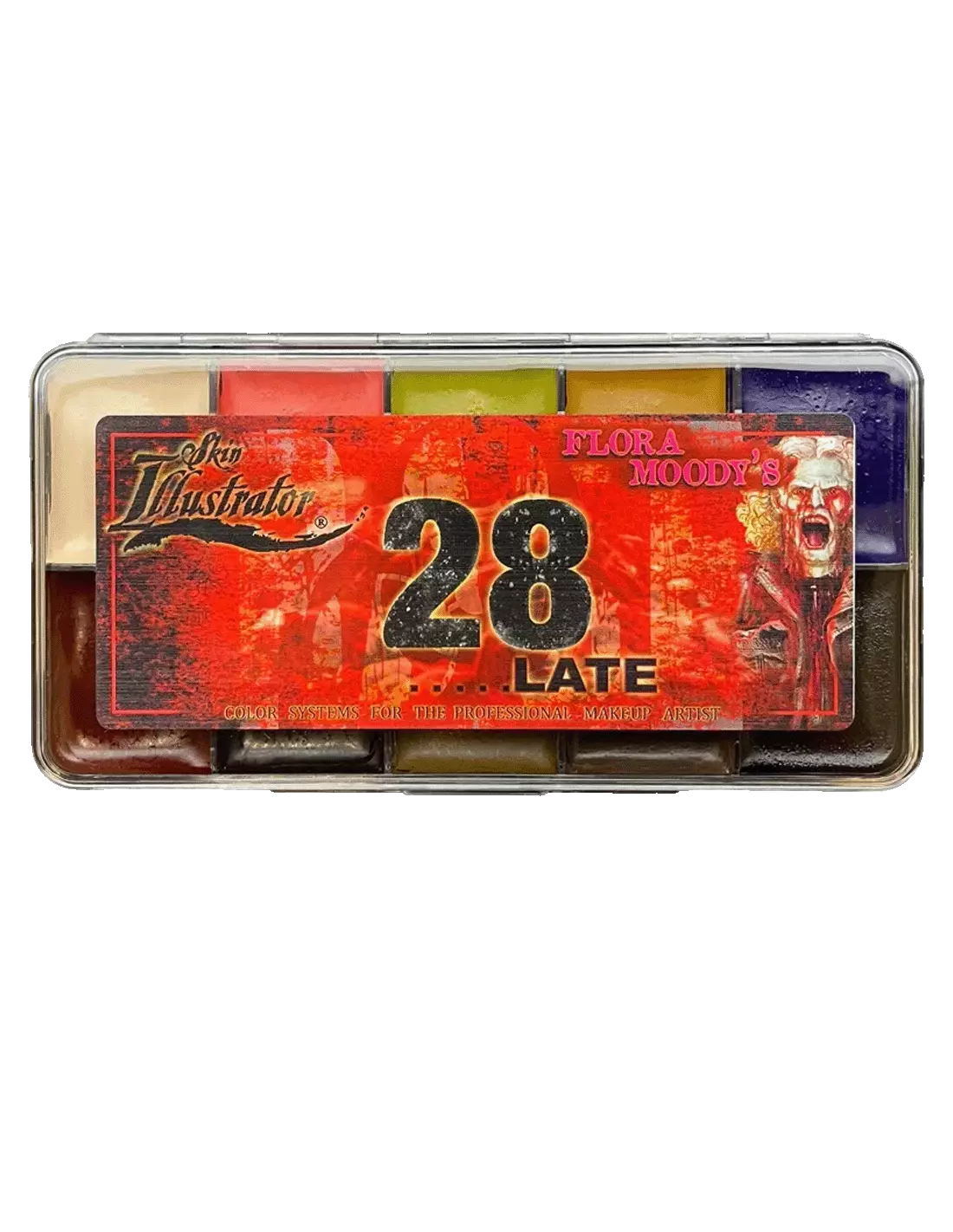 The Skin Illustrator 28 Late palette is an alcohol-activated makeup collection created by Flora Moody for the film 28 Years Later. It includes 10 colours — among them two new ones, Dr Kelson Yellow and Infected — formulated to be applied directly onto skin, silicone and latex with professional special effects finishes.