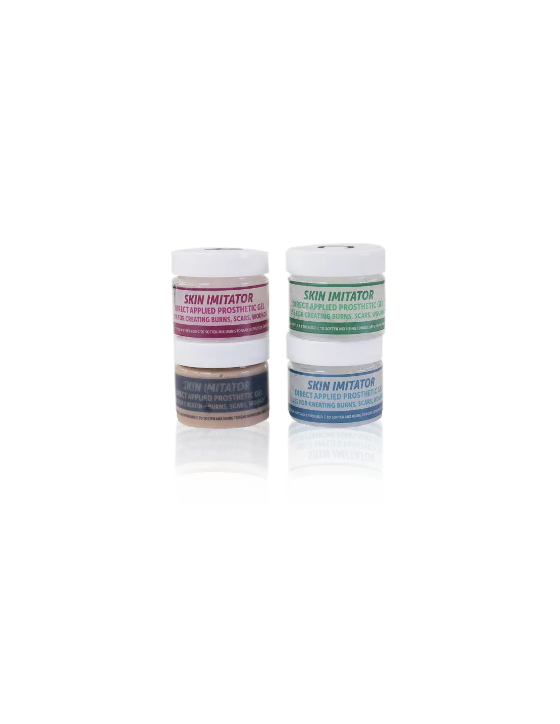 Skin Imitator is an adhesive platinum silicone formulated by SculptGel to create makeup effects directly on skin: open wounds, scars, burns, lacerated skin and all kinds of prosthetic effects in direct contact. The 200 ml kit includes two bases (clear and flesh), a common catalyst and a thinner to adjust fluidity, with a cure time of just 5-7 minutes on skin.