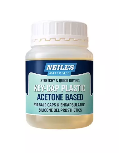 Key-Cap Plastic es el encapsulante base acetona desarrollado por Neill Gorton, diseñado para encapsular prótesis de gel de silicona y para fabricar calotas (bald caps) de alta calidad. Sus bordes se disuelven con acetona, lo que permite un acabado imperceptible sobre la piel y una integración perfecta en cualquier look de efectos especiales.