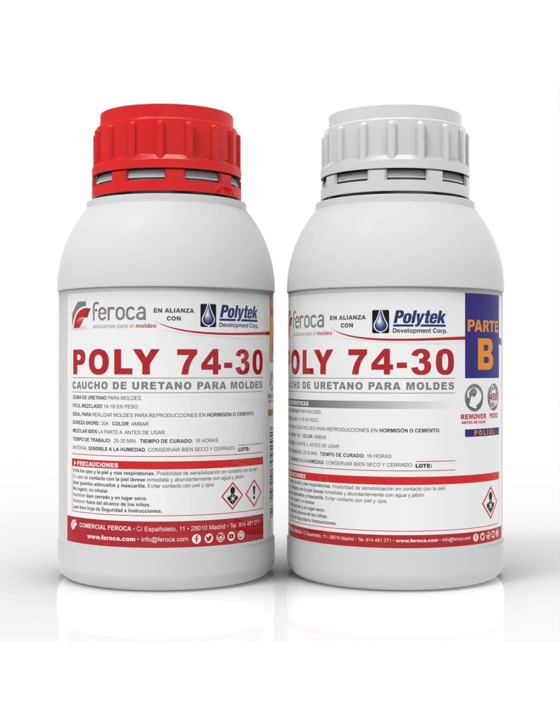El Poly 74-30 es un caucho de poliuretano de colada con dureza Shore A30 diseñado para la fabricación de moldes flexibles de alta producción. Su mezcla a partes iguales, su amplio tiempo de trabajo y su excelente compatibilidad con hormigón y cemento lo convierten en una referencia sólida para talleres de reproducción arquitectónica, escultura y ornamentación.