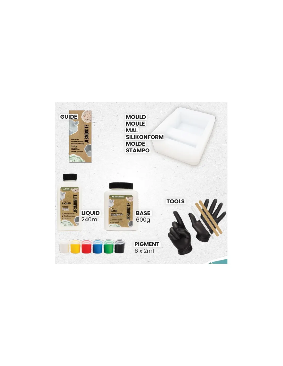 | Contenido del kit | 240 ml de líquido base Jesmonite · 600 g de base Jesmonite · 6 pigmentos (2 ml c/u) · 1 molde soporte para móvil · 1 pipeta · 2 guantes · 2 palitos de agitación |