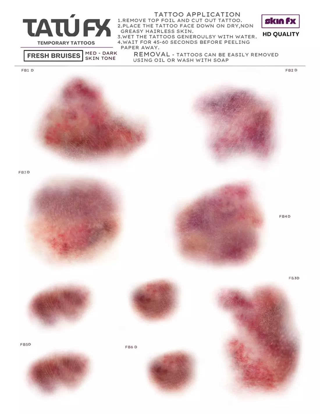 TATÚ FX Fresh Bruises Dark Skin es una hoja A5 de tatuajes temporales de hematomas diseñada específicamente para pieles medias y oscuras. Cada diseño replica con precisión las distintas fases evolutivas de un moratón real, desde el impacto reciente hasta la resolución, logrando una integración cromática natural sin correcciones de color adicionales. Ideal para producciones de cine, teatro, efectos especiales y simulaciones médicas donde el tiempo y el realismo son críticos.