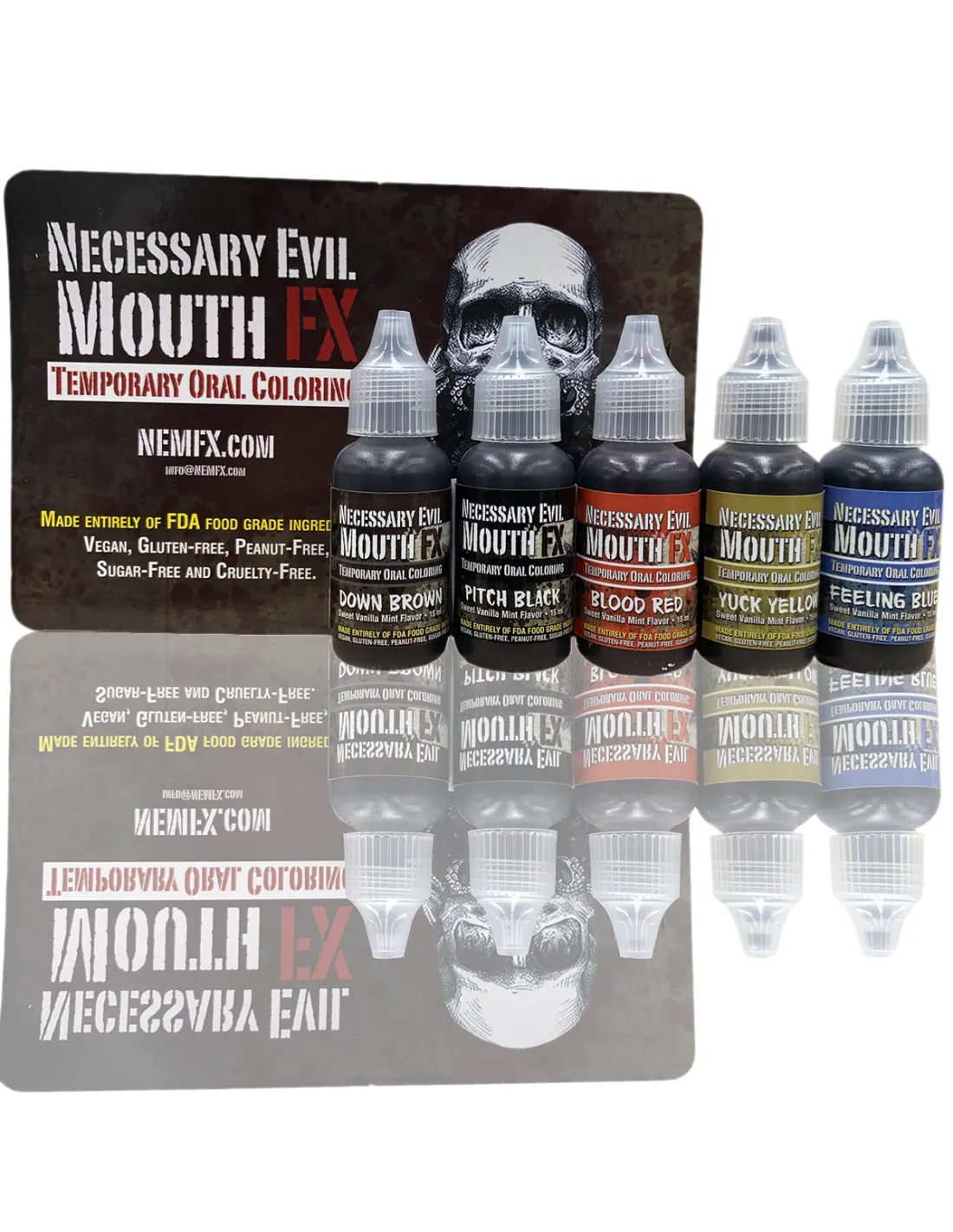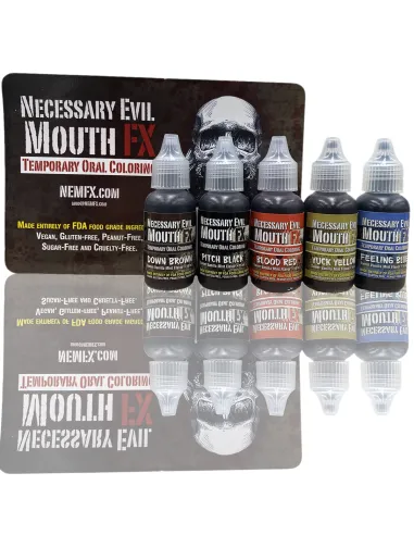 Mouth FX Kit 1 es un sistema de coloración oral temporal fabricado íntegramente con ingredientes de grado alimentario (certificación FDA), diseñado para colorear de forma segura el interior de la boca en efectos especiales, caracterización teatral y cine. Con sabor a vainilla y menta, es vegano, sin gluten, sin cacahuete, sin azúcar y sin crueldad animal. El Kit 1 incluye cinco colores esenciales para crear efectos de descomposición, sangre, enfermedad o caracterizaciones oscuras.