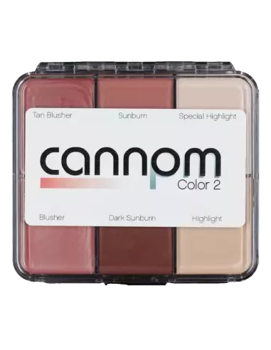 La paleta Cannom Color 2 incluye seis colores: Tan Blusher, Sunburn, Special Highlight, Blusher, Dark Sunburn y Highlight. Son los tonos seleccionados personalmente por Greg Cannom para sus trabajos más reconocidos en cine y cubren las necesidades básicas de carnación, enrojecimiento e iluminación.