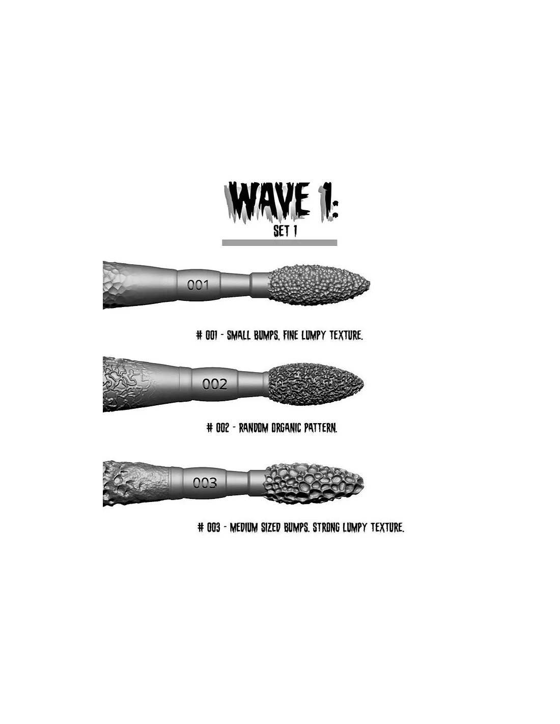 Wave1-001 y Wave1-002 generan microtexturas de piel muy finas, prácticamente imposibles de conseguir con herramientas de escultura convencionales y que resultan especialmente adecuadas para prótesis faciales realistas. Wave1-003 produce una textura orgánica más gruesa, ideal para pieles de reptil, criaturas ficticias o cualquier superficie que requiera irregularidad pronunciada. Cada herramienta incluye tres tamaños de su textura respectiva.