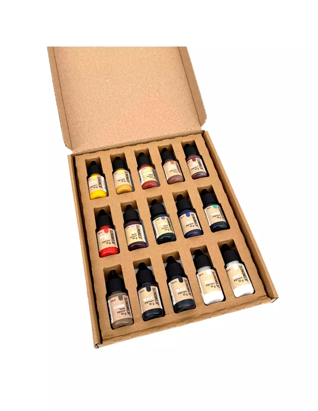 El Jesmonite Pigment Set reúne 15 envases de 10 g con 13 colores formulados específicamente para trabajar con Jesmonite AC100 y sistemas similares a base de acrilato. Su alta concentración permite alcanzar tonos intensos con dosis mínimas, y su integración en la mezcla acuosa de Jesmonite es limpia y homogénea sin alterar el fraguado ni la resistencia final de la pieza.