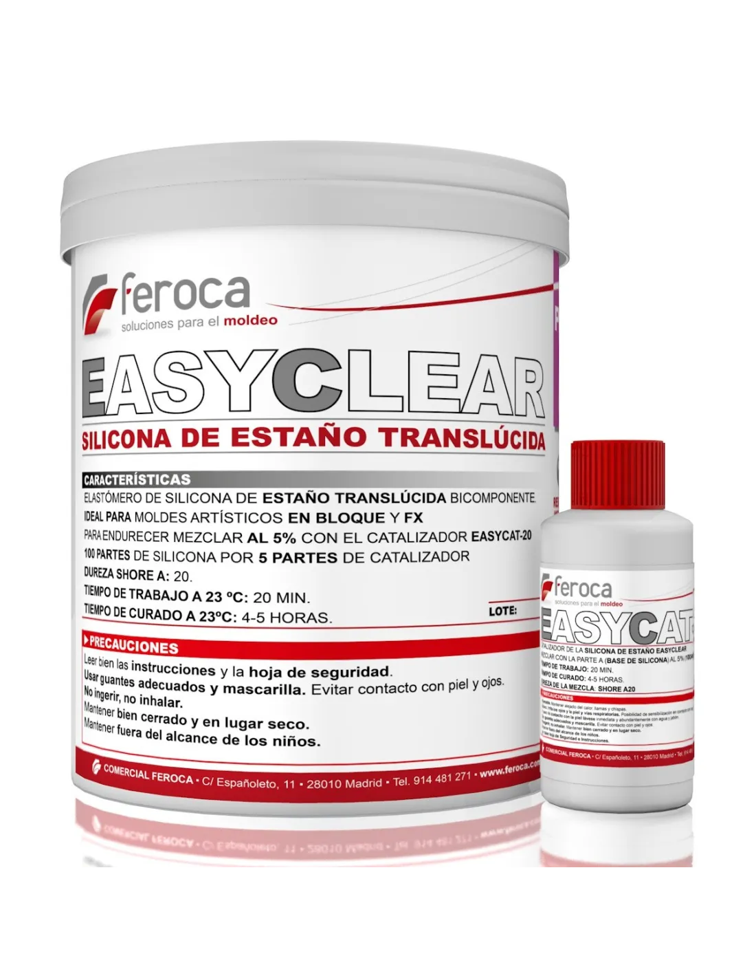 EASYCLEAR es una silicona bicomponente de condensación (estaño) translúcida con dureza Shore A20 y curado a temperatura ambiente en 4-5 horas. Su acabado translúcido y su baja viscosidad la hacen especialmente práctica cuando necesitas ver el original a través del molde, localizar planos de corte con precisión o trabajar en aplicaciones de efectos especiales que requieren un material blando y transparente.