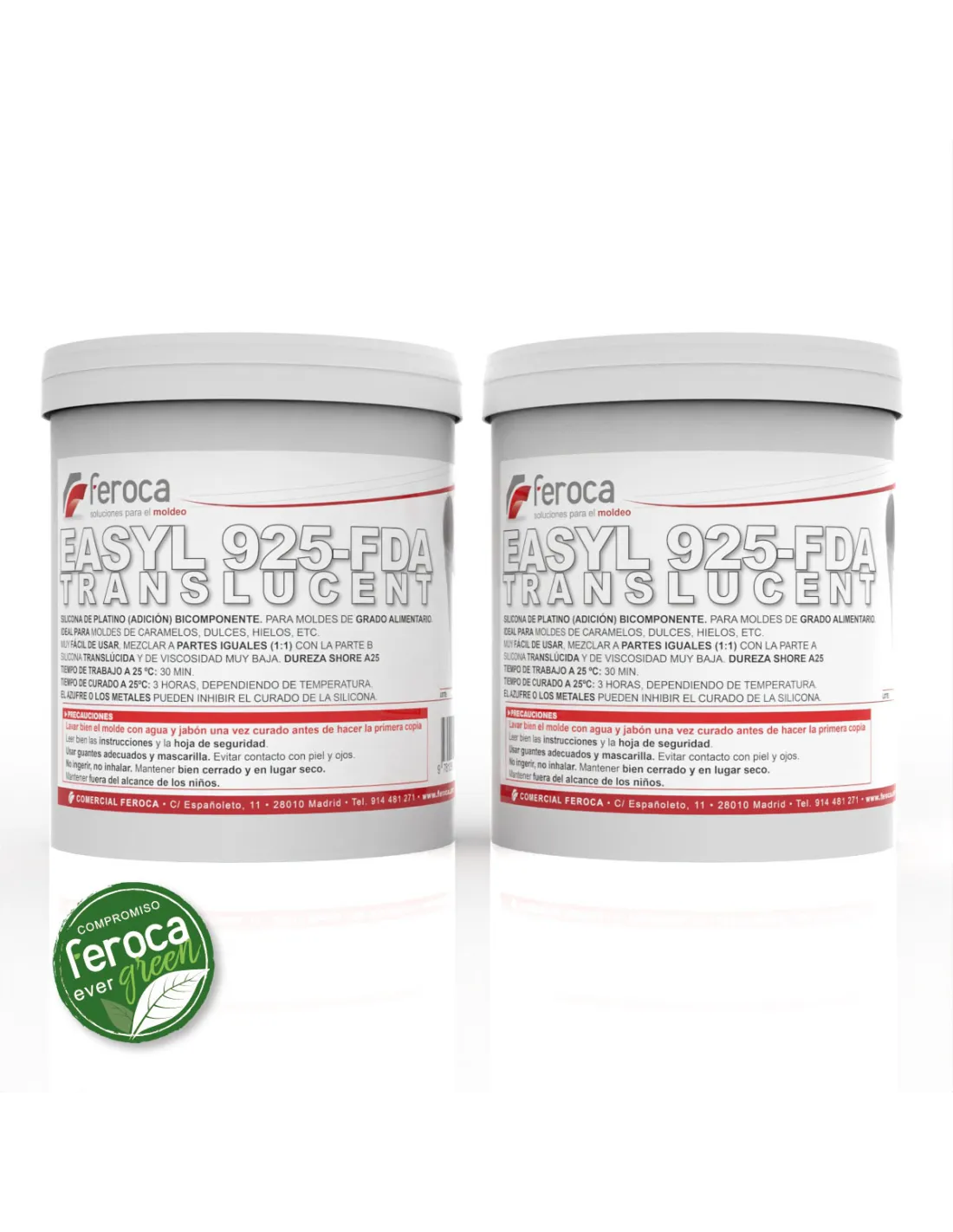 La Easyl 925-FDA es una silicona de platino (adición) de grado alimentario certificada FDA, formulada para fabricar moldes en contacto directo con alimentos. Con dureza Shore A25, viscosidad baja y mezcla 1:1 en peso y volumen, combina facilidad de uso con prestaciones técnicas excelentes: contracción inapreciable, resistencia al calor hasta 220 °C y translucidez que facilita la inspección del molde y del producto final.