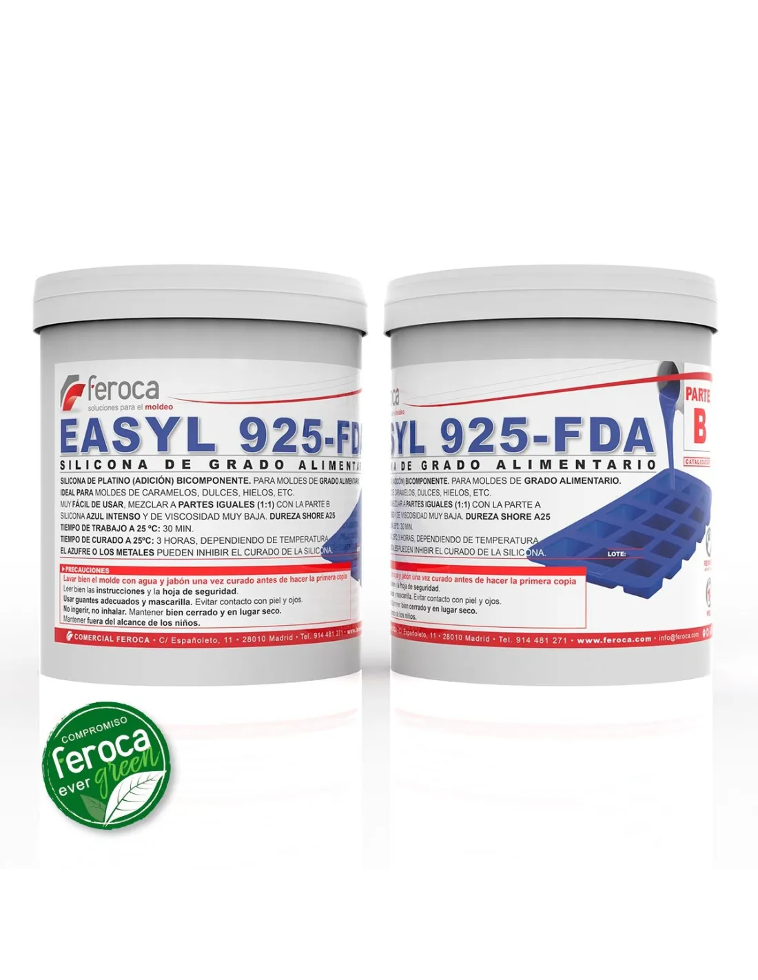 Sí. Feroca dispone de otras referencias de siliconas alimentarias FDA en la gama Easyl. Si necesitas una dureza diferente, consulta la Easyl 940-FDA Pink, disponible en Shore A40 para moldes que requieren mayor rigidez y definición de aristas.