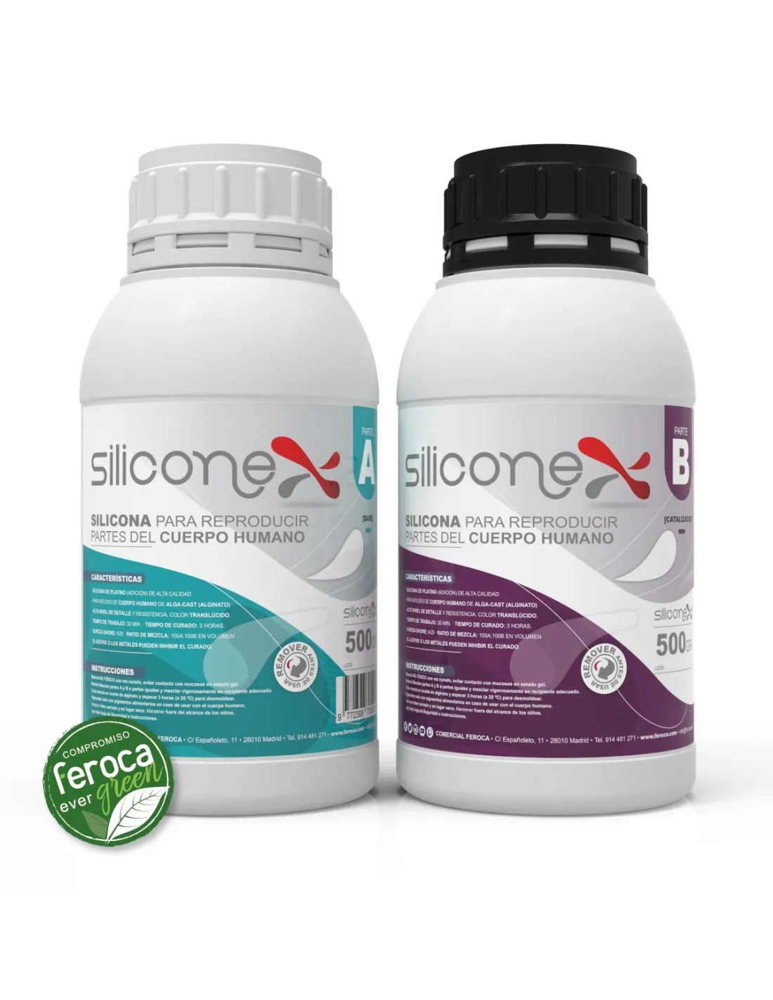 Silicone X es una silicona de platino (adición) de Shore A25 formulada específicamente para colar en moldes de alginato y obtener reproducciones flexibles y exactas de partes del cuerpo humano. Su ratio de mezcla 1:1 en peso y volumen simplifica el proceso, y una vez curada ofrece una goma resistente al desgarro, con contracción mínima y certificada como segura para el contacto con la piel.