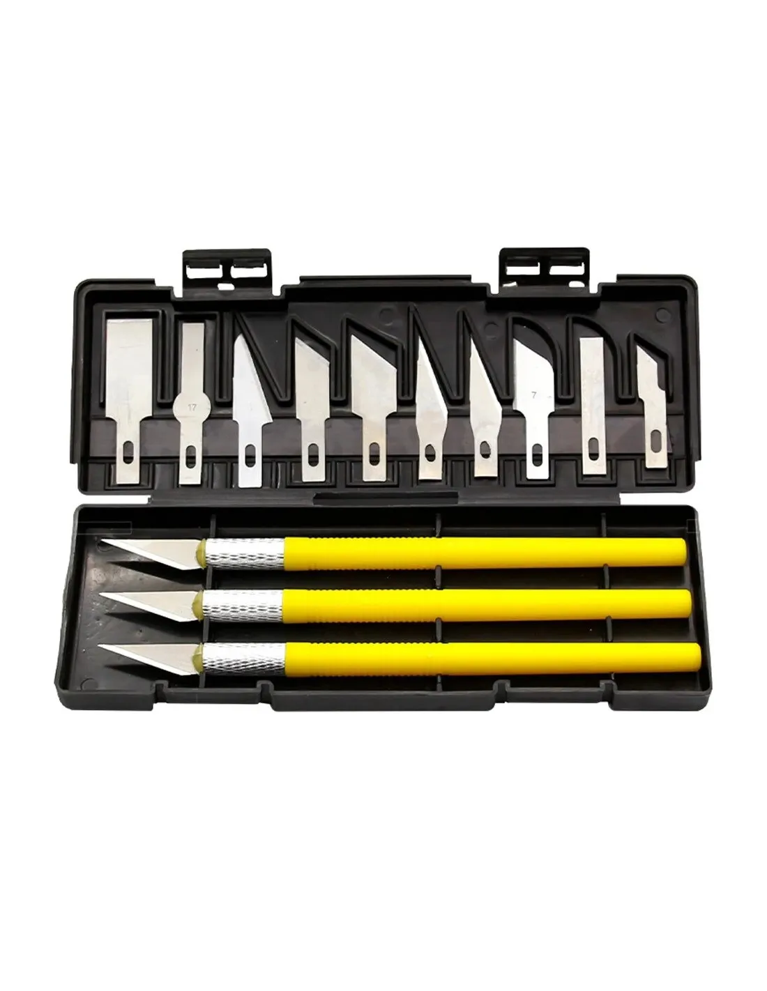 Le set comprend 13 lames interchangeables de différentes géométries ainsi que 3 manches. Les lames sont de type standard compatible avec les manches de scalpel de précision, vous pouvez donc les renouveler ou compléter l'assortiment lorsqu'elles sont épuisées.