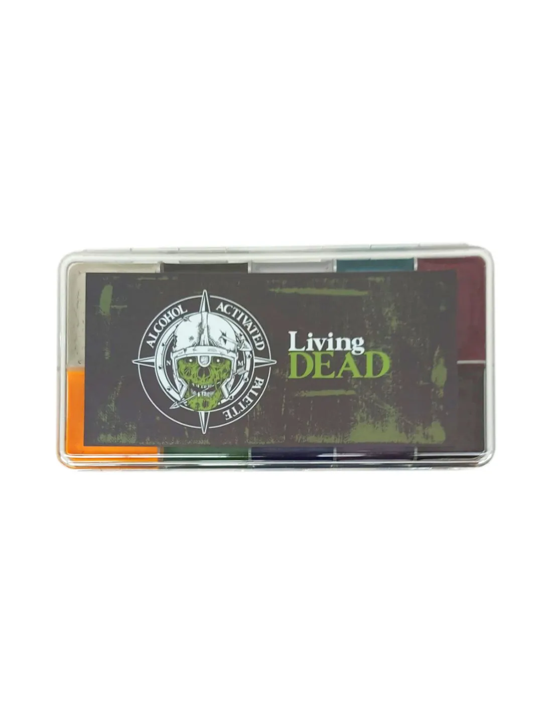 La palette Living Dead est conçue pour les caractérisations d'effets spéciaux qui nécessitent des tons cadavériques, des blessures et des dégradés organiques d'aspect maladif. Sa gamme chromatique couvre les tons pâles et grisâtres jusqu'aux rouges de sang frais et brun de sang séché, en passant par les bleus veineux et les violets d'hématomes.