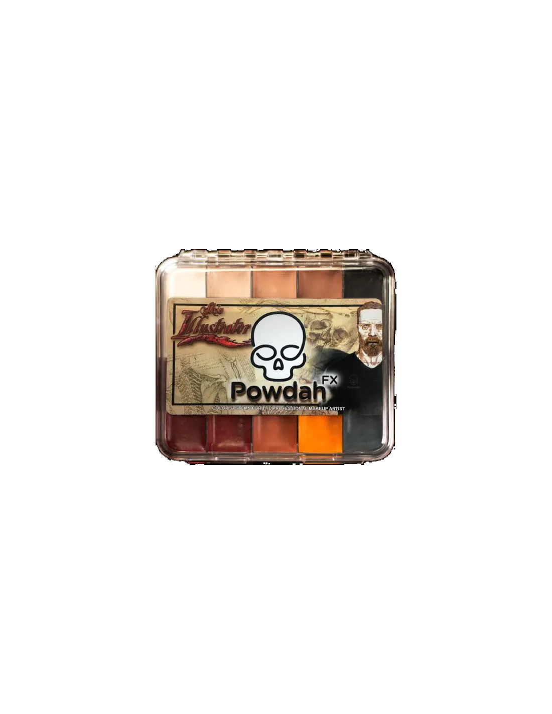La Skin Illustrator Powdah On Set Palette est une palette de maquillage à l'alcool de 12 couleurs conçue en collaboration avec l'artiste d'effets spéciaux Marc Clancy (Powdah). Pensée spécifiquement pour créer des blessures réalistes et du moulage, elle réunit en un seul format les teintes indispensables pour la caractérisation SFX, avec une couverture et une tenue exceptionnelles sur peau, silicone et latex.
