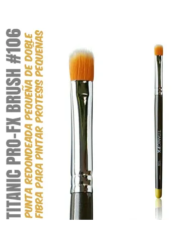 Le Titanic Pro-FX Brush 106 est un pinceau stipple à petite pointe plate et double fibre, conçu spécifiquement pour le maquillage d'effets spéciaux et le travail avec les prothèses. Ses poils synthétiques vegan résistent aux solvants courants du secteur et le manche est collé avec un adhésif à haute résistance chimique, pensé pour supporter les exigences de l'atelier et du plateau de tournage.