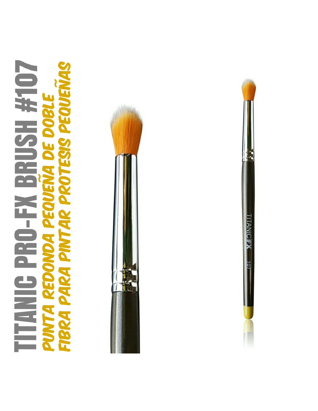Le Titanic Pro-FX Brush 107 est un pinceau stipple à petite pointe ronde et double fibre, conçu spécifiquement pour les techniques de salpicado manuel en maquillage d'effets spéciaux. Ses poils synthétiques vegan résistent au contact avec les solvants et sa virole est fixée avec un adhésif spécial qui supporte les produits de l'atelier FX, des silicones pigmentées aux dissolvants de prothèses.