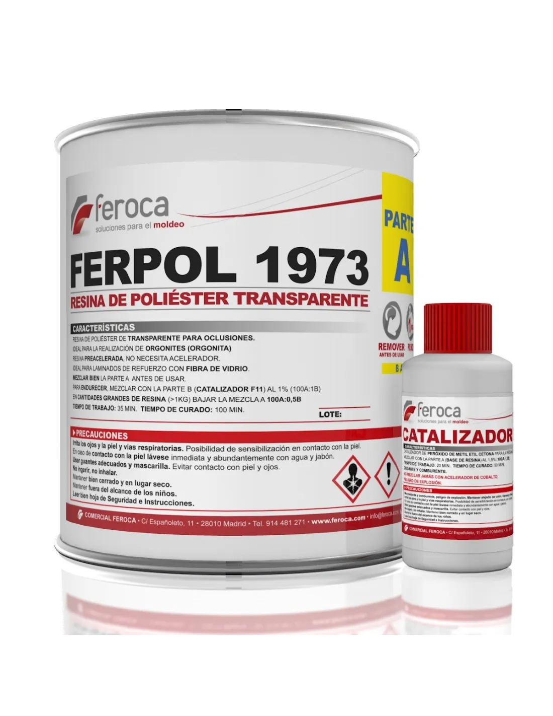 Ferpol 1973 est une résine polyester transparente et incolore formulée spécifiquement pour les occlusions : elle permet d'encapsuler des pièces, des objets décoratifs et des éléments organiques à l'intérieur de la masse durcie avec une finition type cristal. C'est l'option de référence pour les orgonites, la bijouterie en résine et les effets décoratifs économiques, avec un ratio de mélange simple de 100 parties de résine pour 2 parties de Catalizador F11.