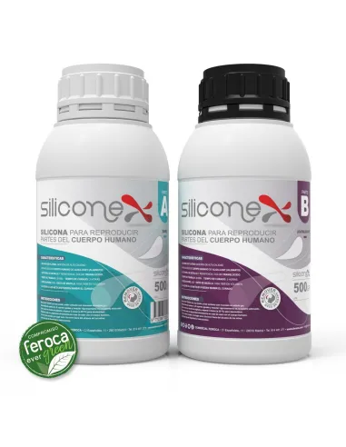 Silicone X est un silicone platine (addition) de Shore A25 formulé spécifiquement pour être versé dans des moules en alginate et obtenir des reproductions flexibles et précises de parties du corps humain. Son ratio de mélange 1:1 en poids et en volume simplifie le processus, et une fois polymérisé il offre un caoutchouc résistant à la déchirure, avec une contraction minimale et certifié sans danger pour le contact cutané.