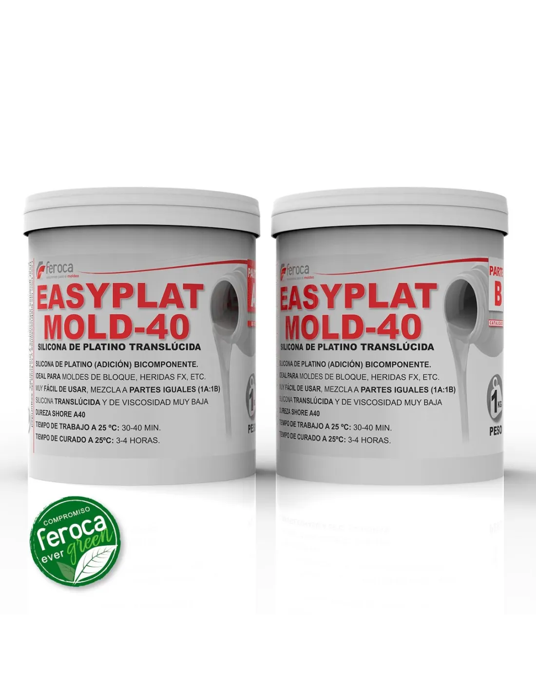 EASYPLAT MOLD-40 est un silicone platine (addition) translucide de dureté Shore A40, formulé pour réaliser des moules blocs dans lesquels vous avez besoin de voir la pièce intérieure pour couper avec précision. Son mélange 1:1 en poids et en volume le rend très pratique à utiliser, et sa faible contraction et sa résistance à la chaleur jusqu'à 220 ºC garantissent des moules durables et fiables pour la production d'effets spéciaux, de transfers, de props et bien plus encore.
