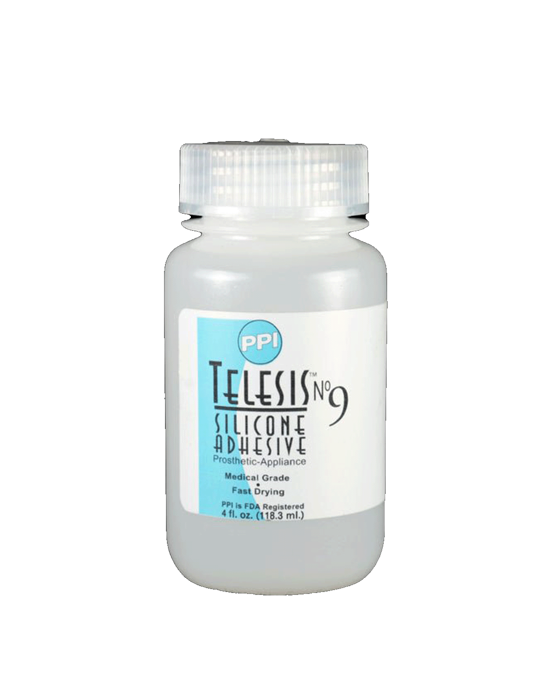 Si consiglia di utilizzare Telesis Silicone Remover in combinazione con Telesis 9. Questo detergente per silicone non oleoso non danneggia le protesi in silicone o lattice o le parti protesiche. Funziona in modo eccezionale anche con tutti gli altri adesivi e diluenti Telesis 8 e Telesis 8F.