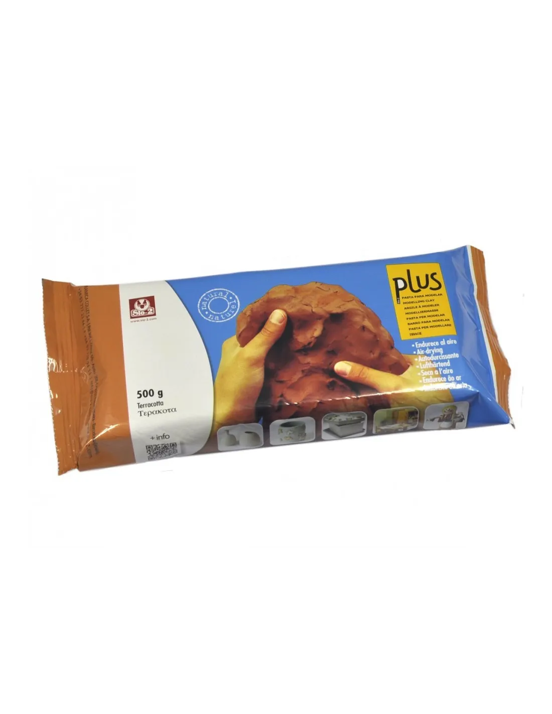 Argilla naturale Sio-2 PLUS Terracotta che indurisce all'aria senza cottura. Alta plasticità, senza crepe, adatta dai 3 anni. Formati da 500 g a 10 kg.