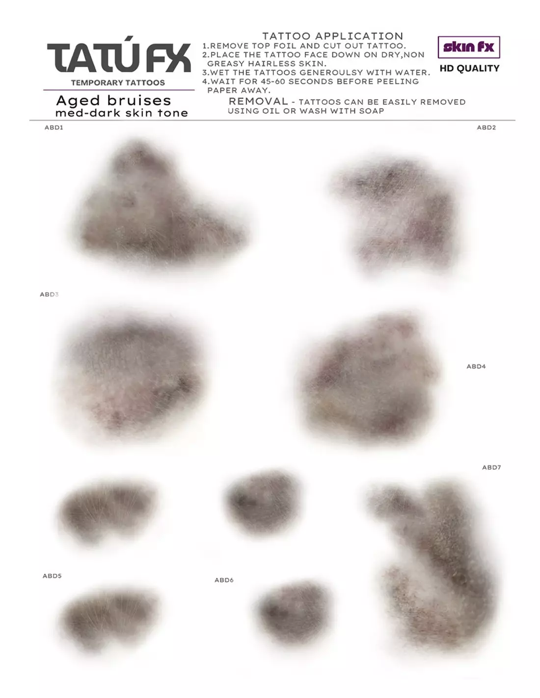 TATÚ FX Aged Bruises Dark Skin è un foglio A5 di tatuaggi temporanei progettato da truccatori professionisti per simulare ematomi in fase avanzata su pelli scure e medio-scure. I 9 design inclusi riproducono la reale evoluzione di un livido di diversi giorni: tonalità profonde violacee, marroni e verdastre che si integrano in modo credibile senza richiedere correzioni di colore aggiuntive. Una soluzione rapida e pronta per la fotocamera su set cinematografici, teatro o formazione medica.