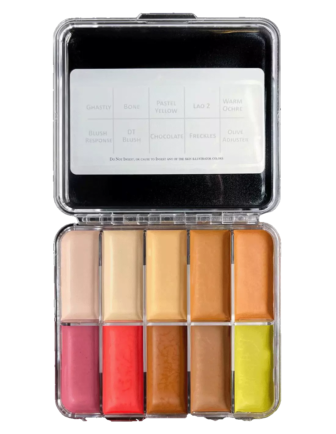 Questa palette è pensata per i professionisti del trucco SFX, della caratterizzazione teatrale e cinematografica che hanno bisogno di abbinare e sfumare bald cap in lattice, silicone o vinile con la carnagione dell'attore in modo rapido e preciso sul set. I 10 colori coprono un'ampia gamma di tonalità dermiche e permettono miscele personalizzate per qualsiasi fototipo.