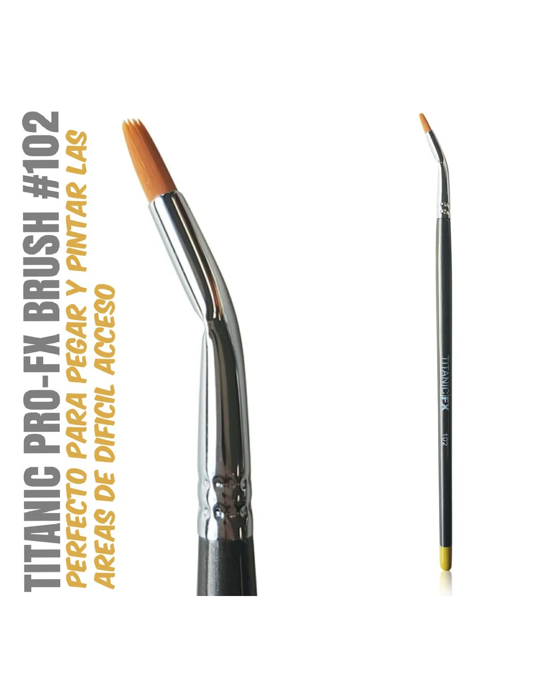 Il Titanic Pro-FX Brush 102 è un pennello delineatore angolato progettato specificamente per il lavoro di trucco per effetti speciali e protesi. Le sue setole sintetiche vegane resistono al contatto con solventi e adesivi utilizzati in FX, mentre l'incollaggio della virola regge le condizioni esigenti del laboratorio e del set. Se hai bisogno di raggiungere bordi, angoli e zone di difficile accesso durante l'incollaggio, la pittura o la sfumatura di protesi, questo è il pennello giusto.