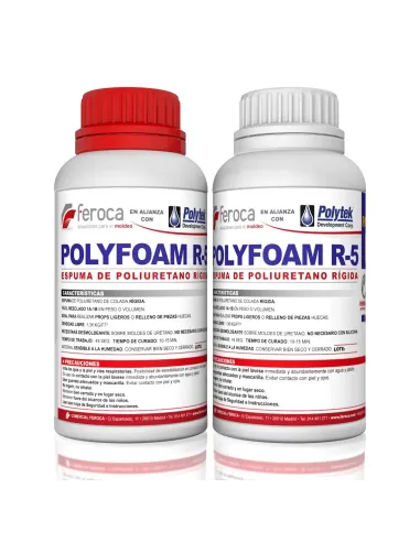 PolyFoam R-5 ha una densità di espansione libera di 80 Kg/m³. In colata aperta la schiuma sale liberamente fino a raggiungere quella densità. In stampo chiuso l'espansione è limitata e la densità finale dipende dalla quantità di materiale introdotto, potendo arrivare fino a 320 Kg/m³. Non si tratta di un moltiplicatore di volume fisso: l'espansione reale dipende sempre dalla quantità di miscela e dal volume dello stampo.