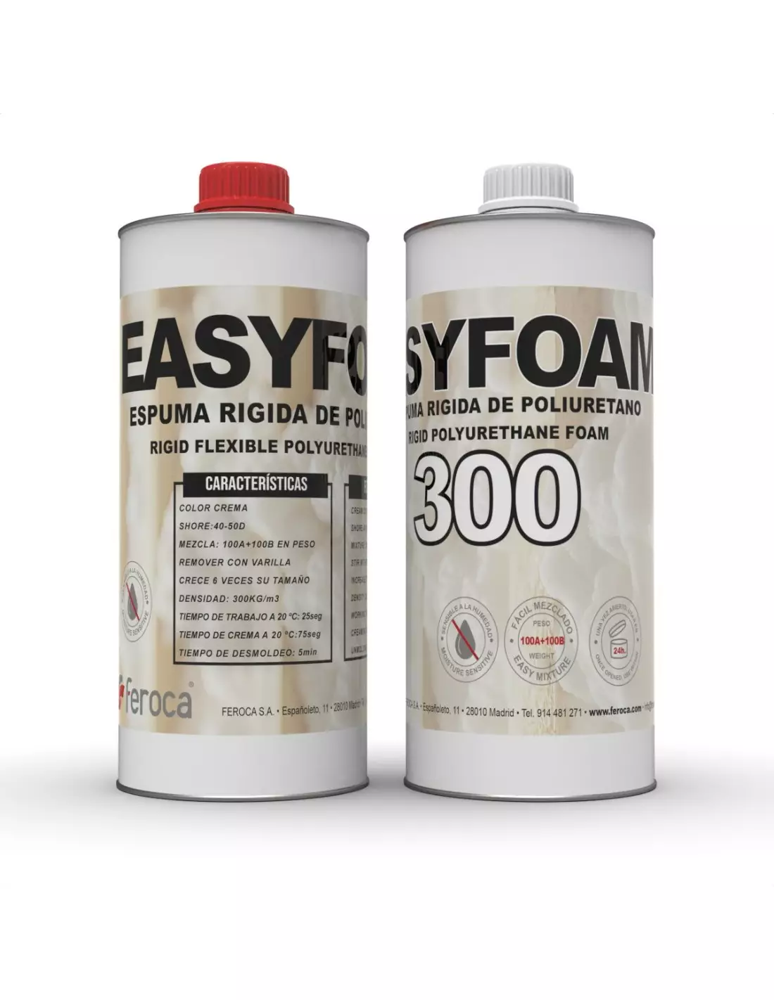 EASYFOAM 300 é uma espuma rígida de poliuretano de dois componentes que expande até 6 vezes o seu volume inicial, atingindo uma densidade moldada de 250-450 kg/m³ e uma dureza Shore 40-50D. A sua proporção de mistura 1:1 em peso torna-a uma das espumas mais simples de usar em oficina, com excelente reprodução de detalhe e acabamento de cor creme. Não contém CFCs nem HCFCs e incorpora aditivos de melhoria de reação ao fogo.