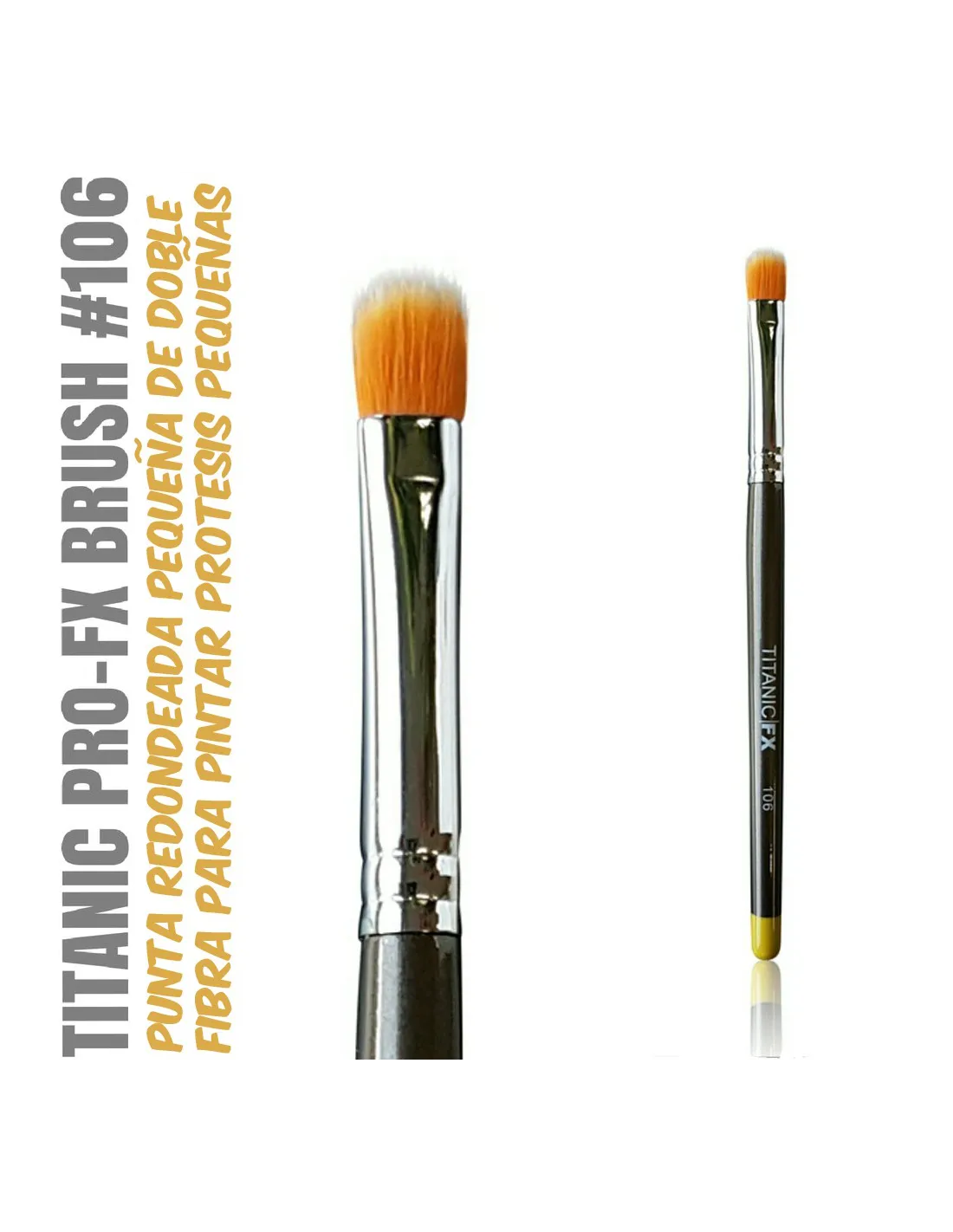 O Titanic Pro-FX Brush 106 é um pincel de stipple com ponta plana pequena e fibra dupla, desenhado especificamente para maquilhagem de efeitos especiais e trabalho com próteses. As suas cerdas veganas sintéticas resistem aos solventes habituais do setor e o cabo está colado com um adesivo de alta resistência química, pensado para aguentar a exigência do atelier e do set de rodagem.