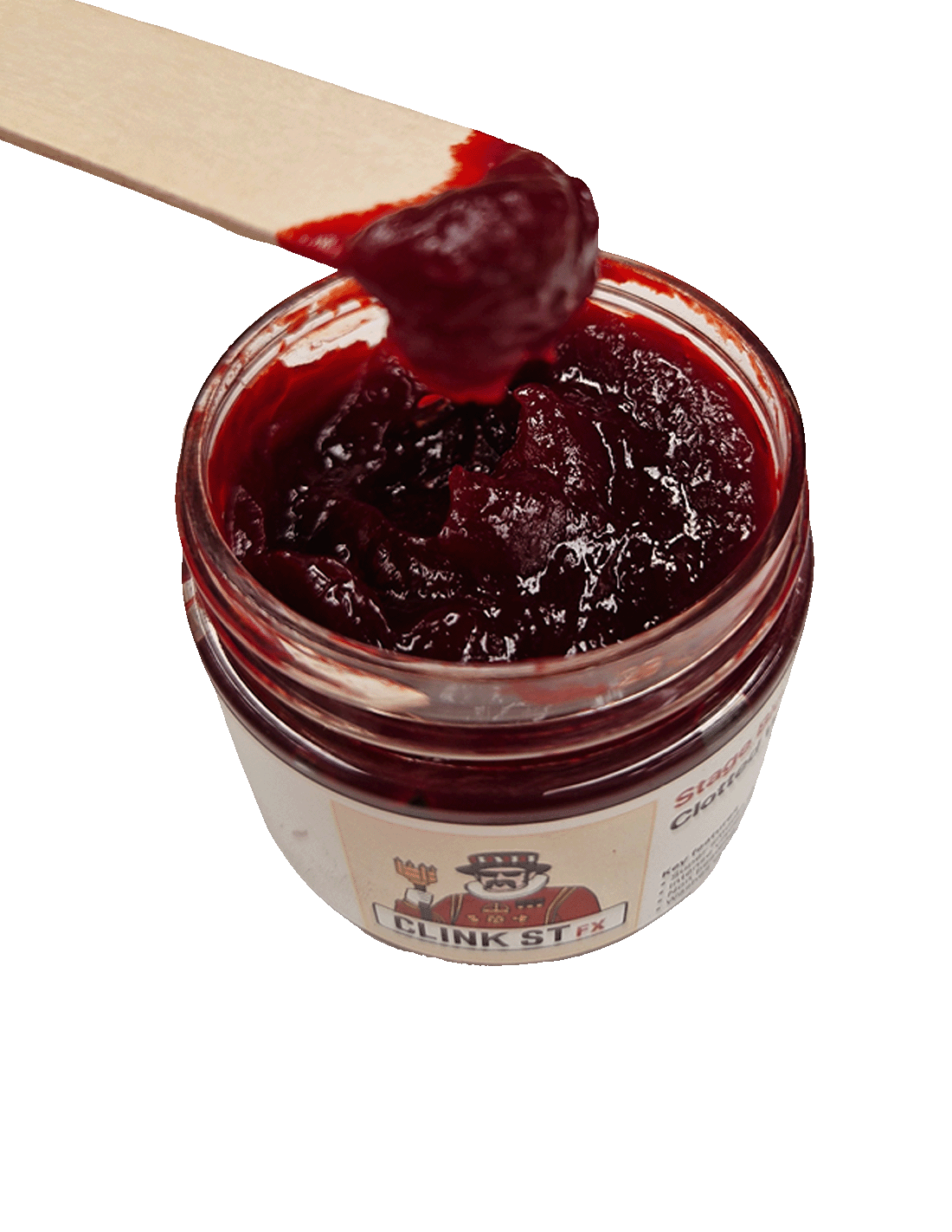 O nosso enchimento de feridas coagulado CLINK é perfeito para preencher cenas de batalha e massacres. Quando seco, adquire uma textura brilhante super suave com uma cor visceral rica. Não mancha e lava-se com água e sabão.
